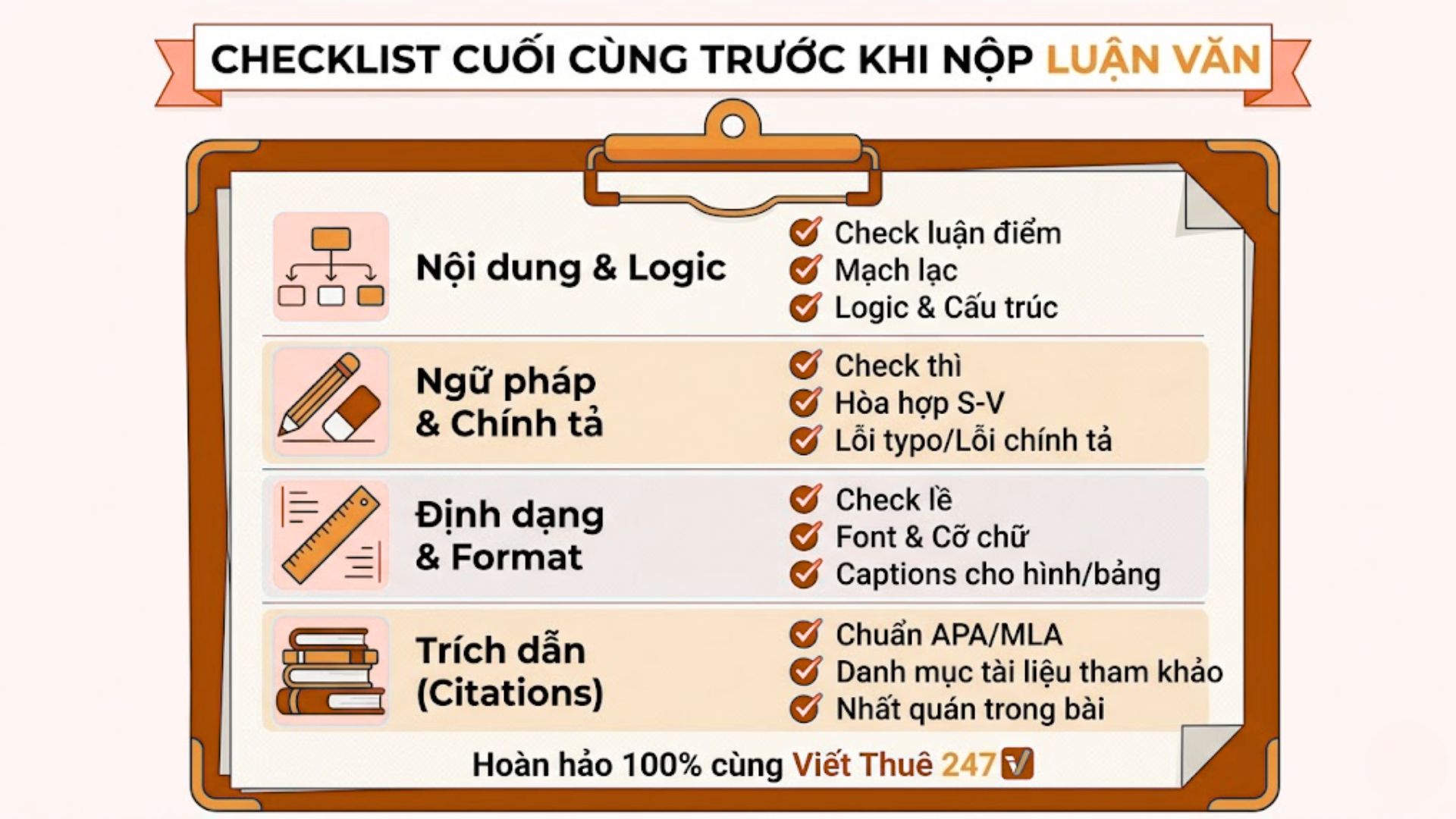 Bảng checklist dưới đây là bộ lọc cuối cùng giúp bạn đảm bảo sự hoàn hảo cho luận văn.
