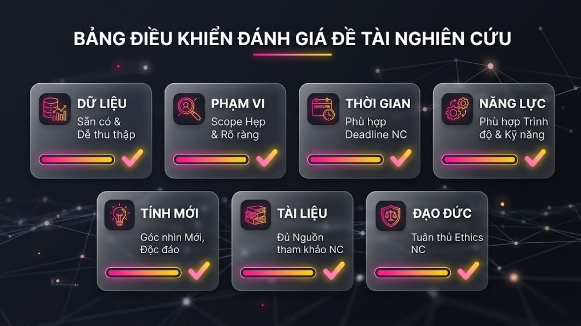 Trước khi chốt đề tài, hãy đánh giá nó qua 7 tiêu chí dưới đây. Đây là bộ tiêu chí thực tế được đúc kết từ kinh nghiệm hướng dẫn luận văn, không phải lý thuyết suông.