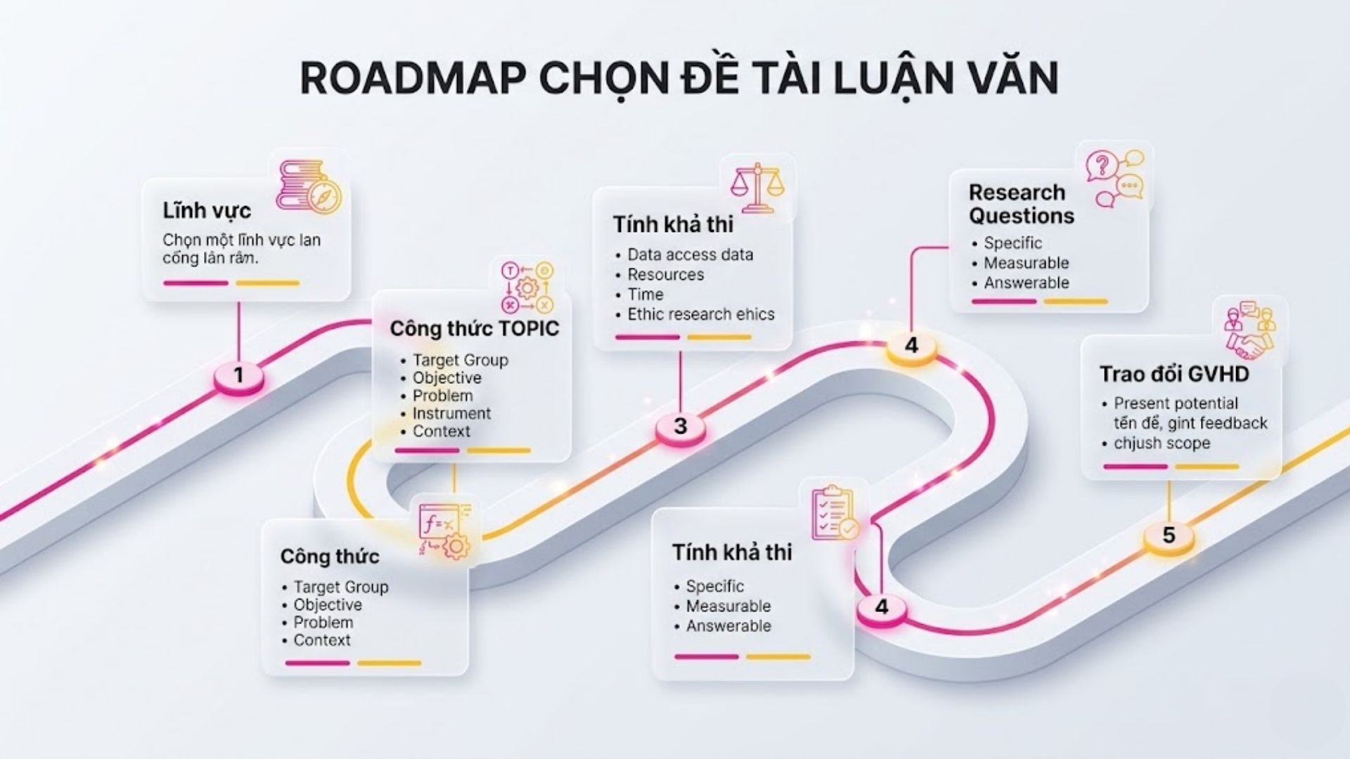 Dưới đây là quy trình 5 bước giúp bạn chọn đề tài luận văn tiếng Anh một cách có hệ thống, tránh “chọn theo cảm tính”.
