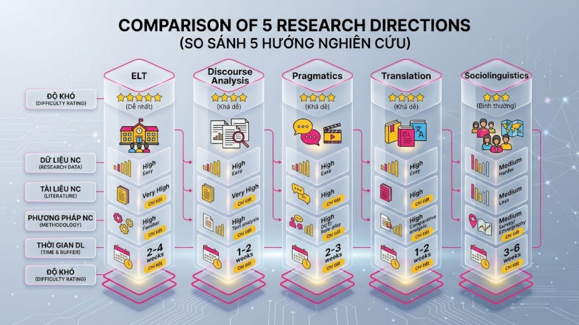 - Kết quả bước này: danh sách 2–3 lĩnh vực tiềm năng (VD: ELT methodology, Discourse Analysis, Translation Studies)