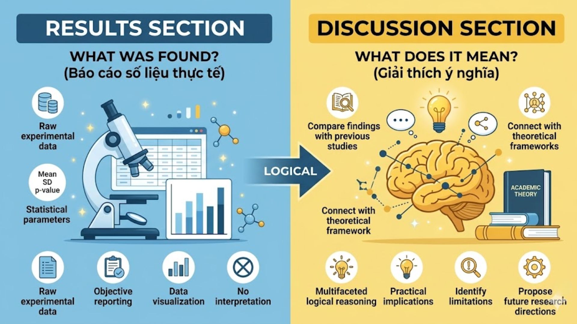 Việc phân định rõ ràng giữa Results (Kết quả) và Discussion (Thảo luận) là yếu tố quyết định chất lượng của một bài nghiên cứu.