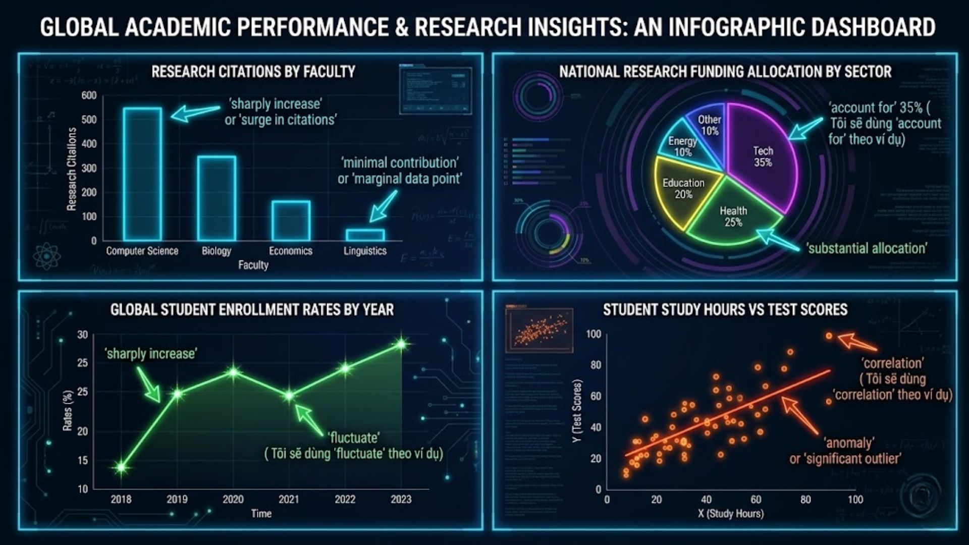 Ví dụ Scatter plot: “The scatter plot reveals a strong positive correlation between study hours and exam performance.”
