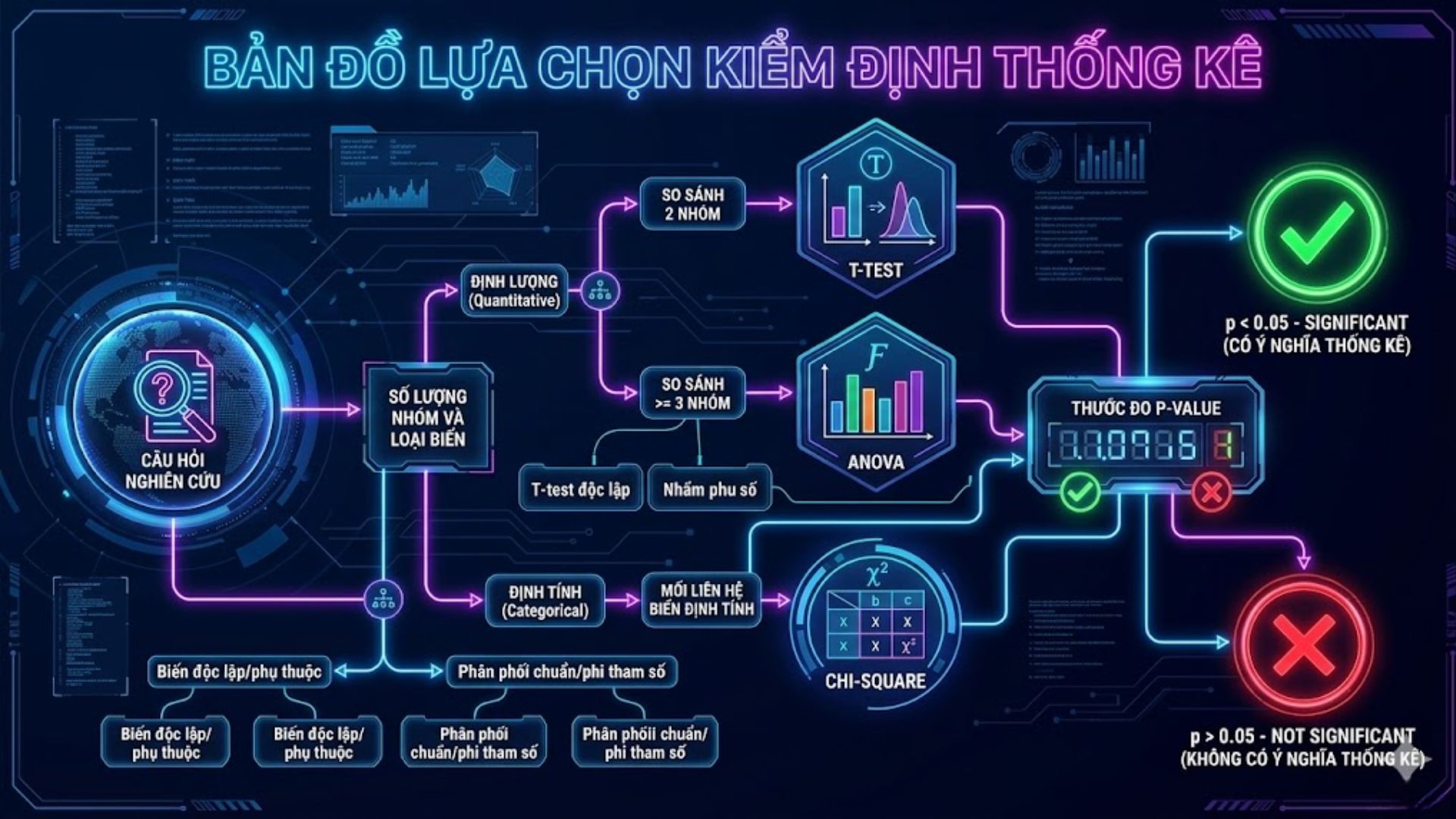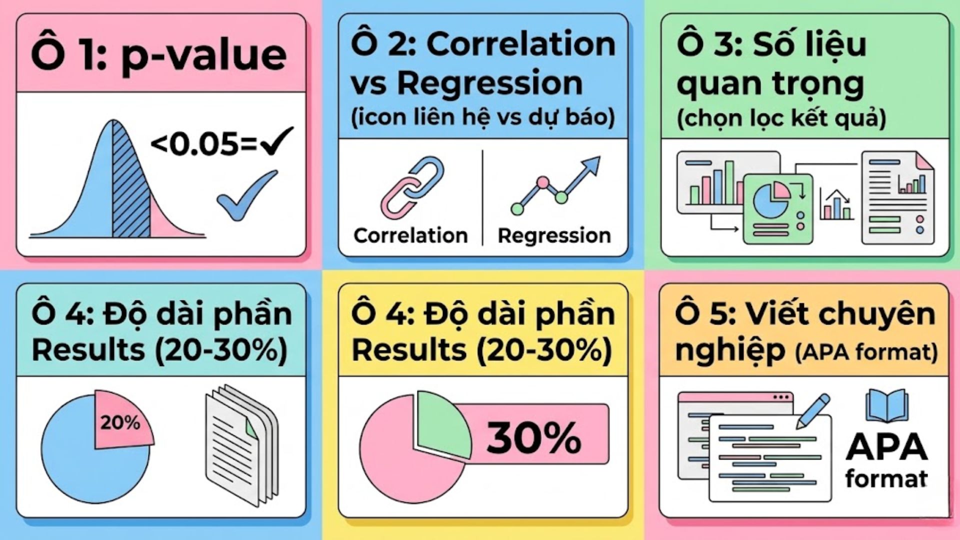 Threshold phổ biến: Thường là 0.05 hoặc 0.01. Nếu p < 0.05, kết quả được coi là có ý nghĩa thống kê.