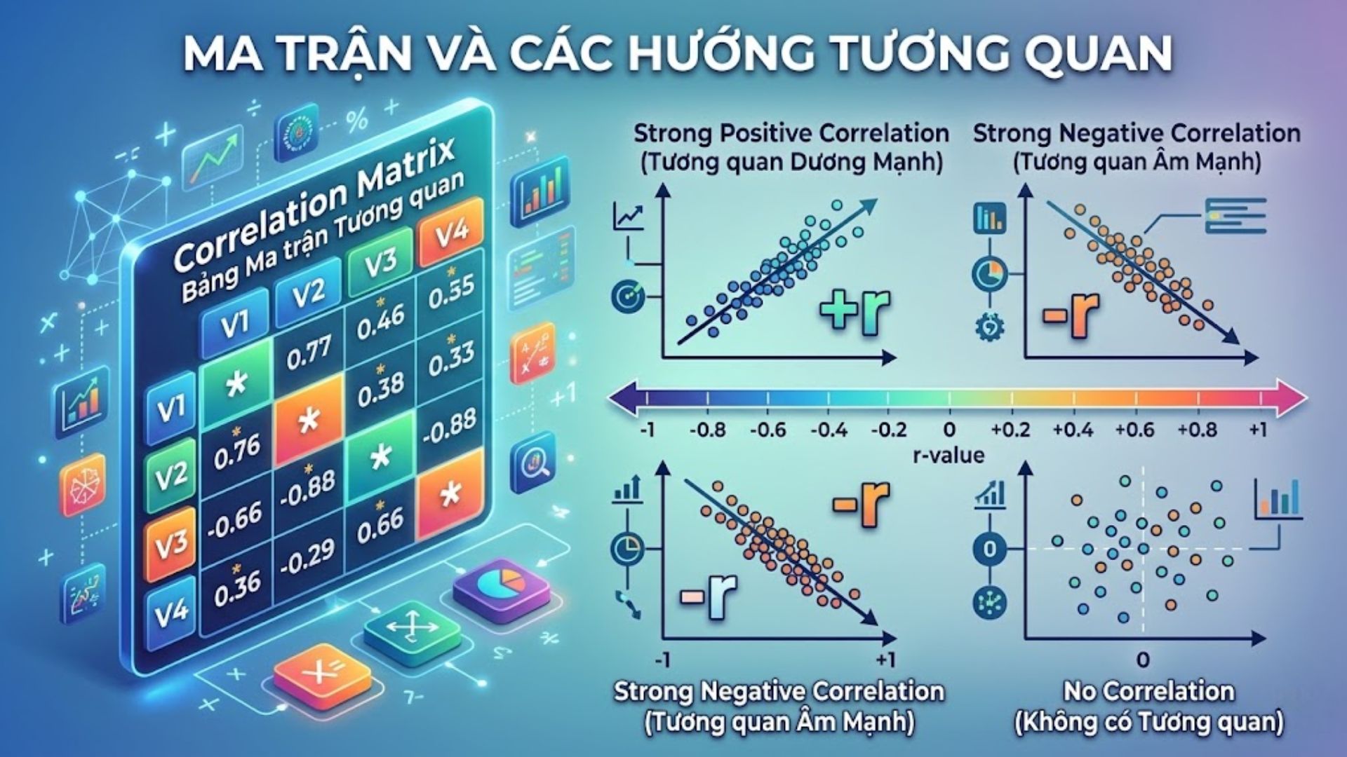 Ý nghĩa r-value: Giá trị từ -1 đến +1. Càng gần 1 hoặc -1, tương quan càng mạnh. 0 là không có tương quan.