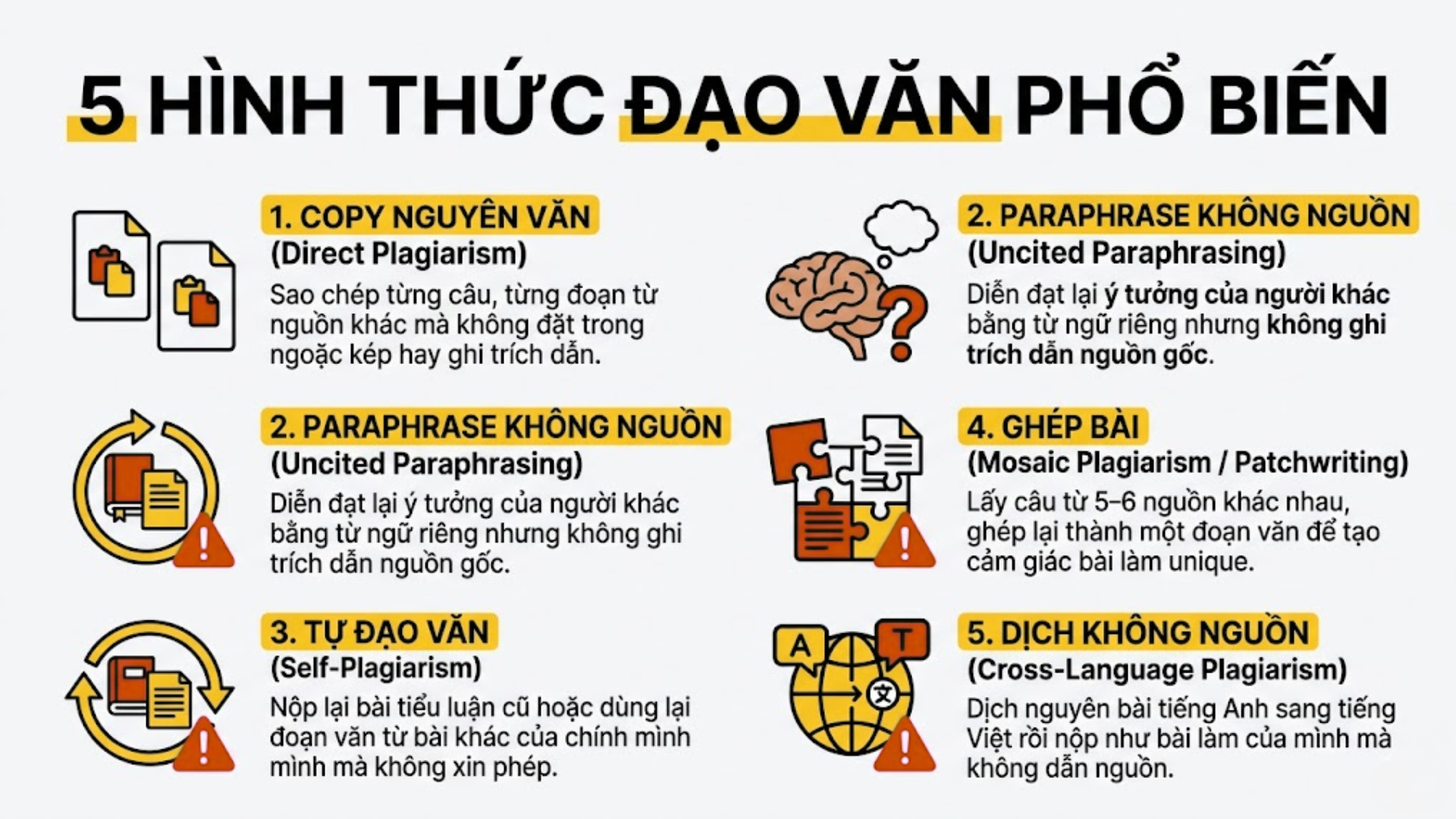 - Ghép bài từ nhiều nguồn (Mosaic Plagiarism): Lấy câu từ 5–6 nguồn khác nhau, ghép lại thành một đoạn văn — tưởng unique nhưng thực chất vẫn là đạo văn
