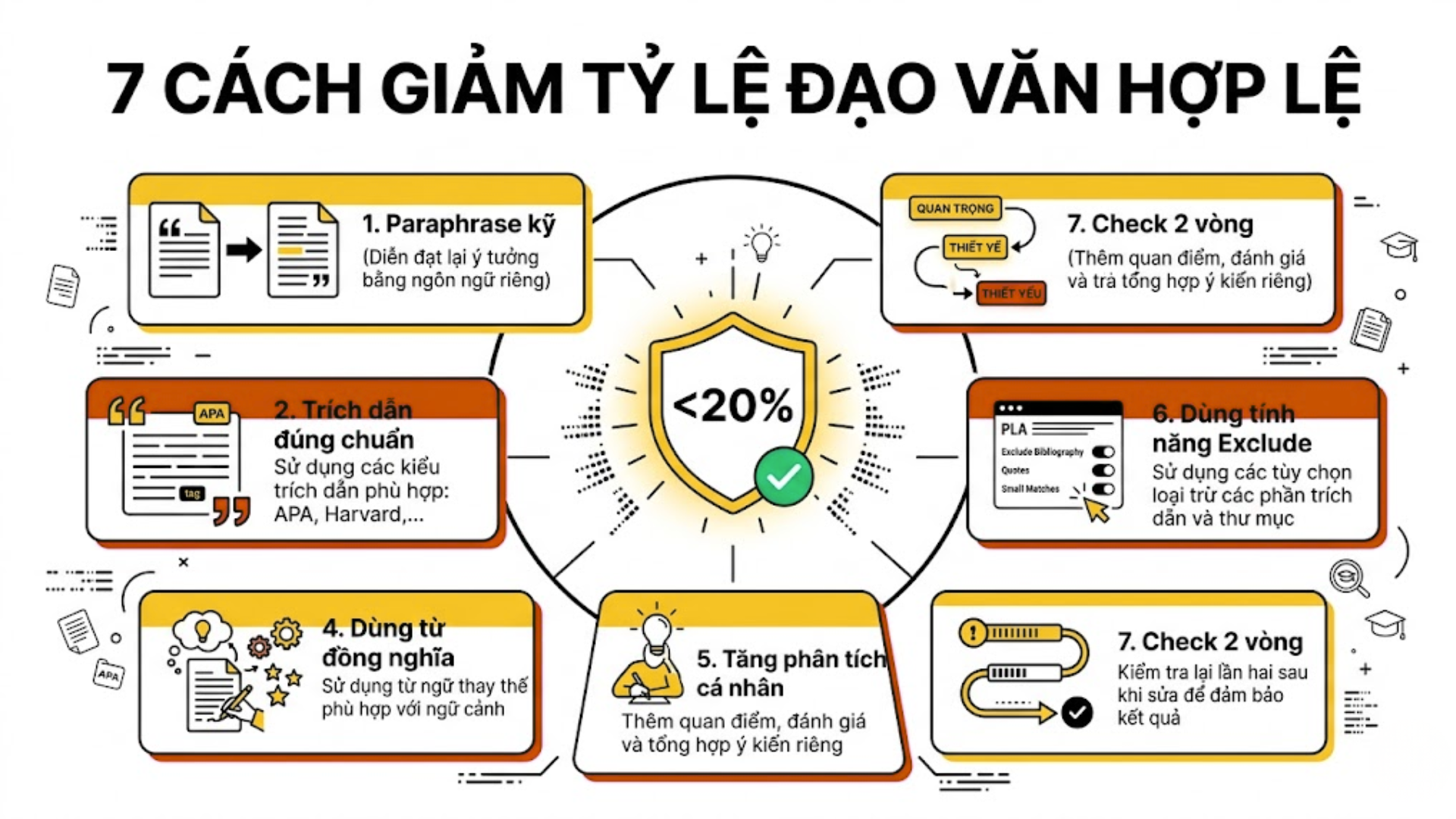 7 kỹ thuật giảm tỷ lệ đạo văn hợp lệ được kiểm chứng thực tế — giúp sinh viên đưa bài tiểu luận xuống dưới ngưỡng 20% mà không vi phạm quy định.