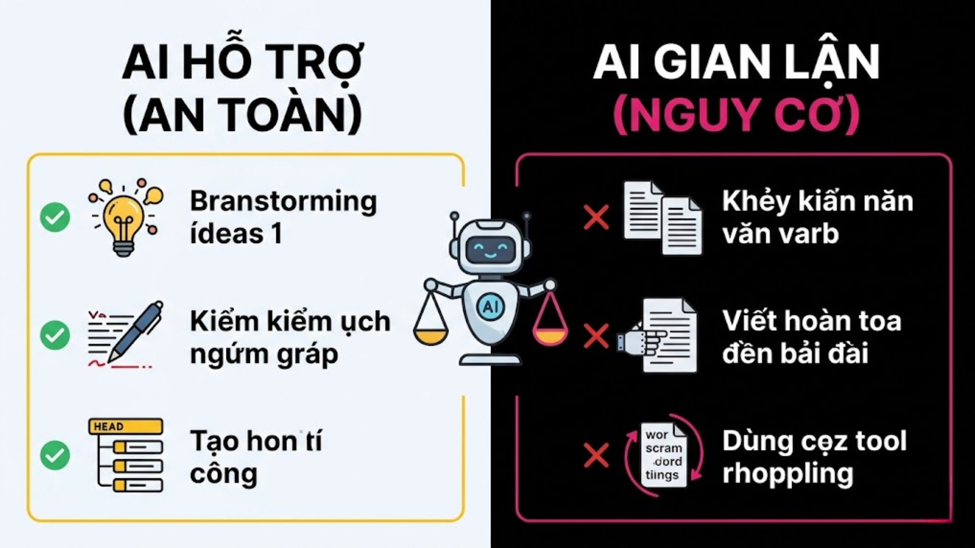 - Copy nguyên văn output AI vào bài mà không chỉnh sửa hay ghi nguồn