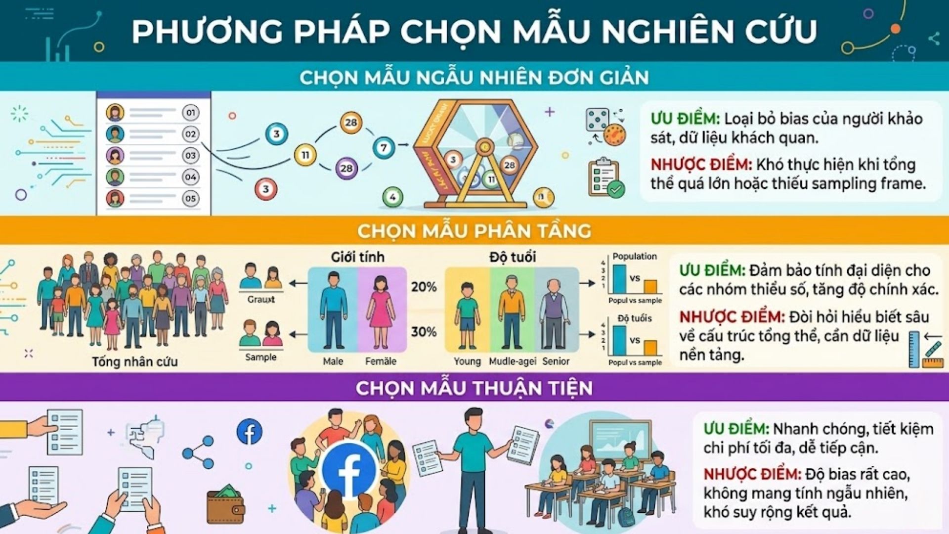 Quy trình chọn mẫu bao gồm 3 phương pháp phổ biến nhất giúp tối ưu hóa tính khách quan và hiệu quả thực hiện.