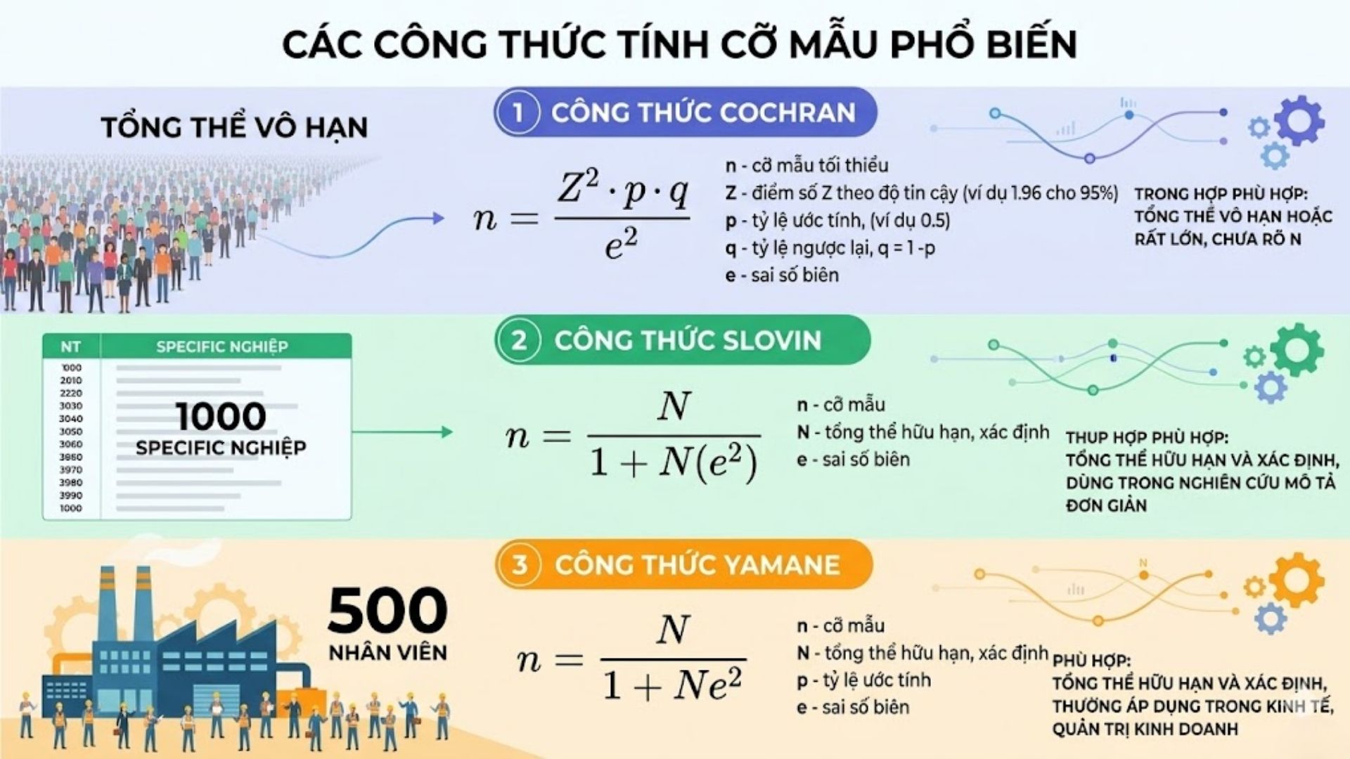 Dưới đây là 3 công thức toán học kinh điển giúp bạn xác lập số lượng mẫu cụ thể dựa trên các tham số thống kê.