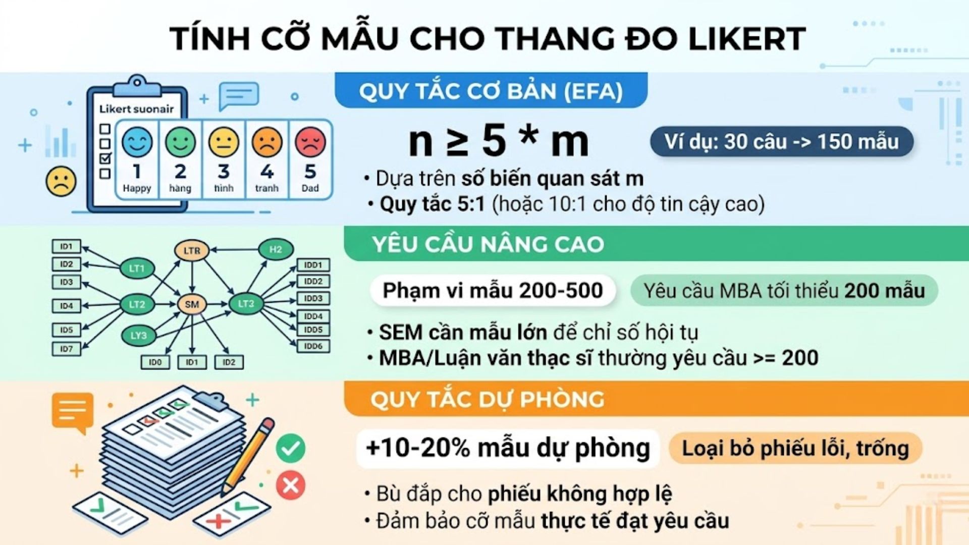| Phân tích SEM | 200 đến 300 mẫu | Đảm bảo các chỉ số thích hợp đạt yêu cầu |