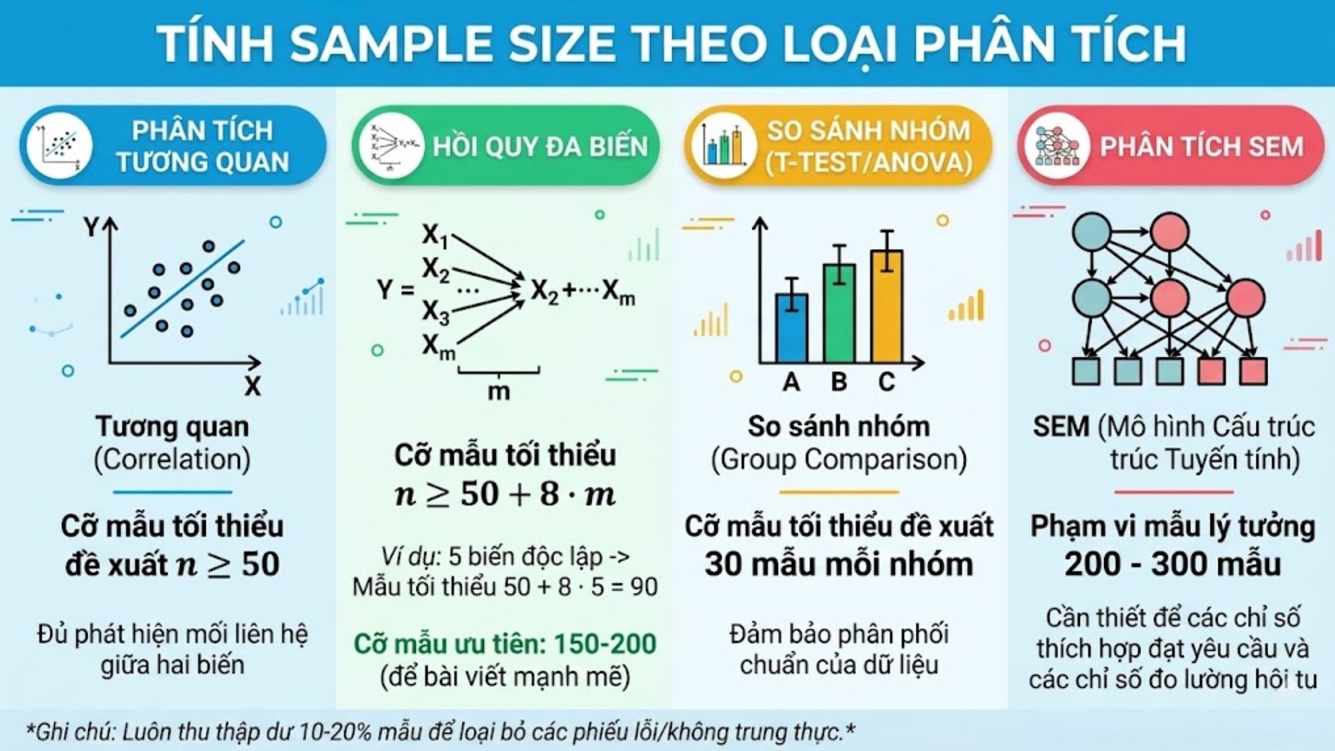 Dự phòng: Nên thu thập dư 10% đến 20% mẫu để loại bỏ các phiếu trả lời không trung thực.