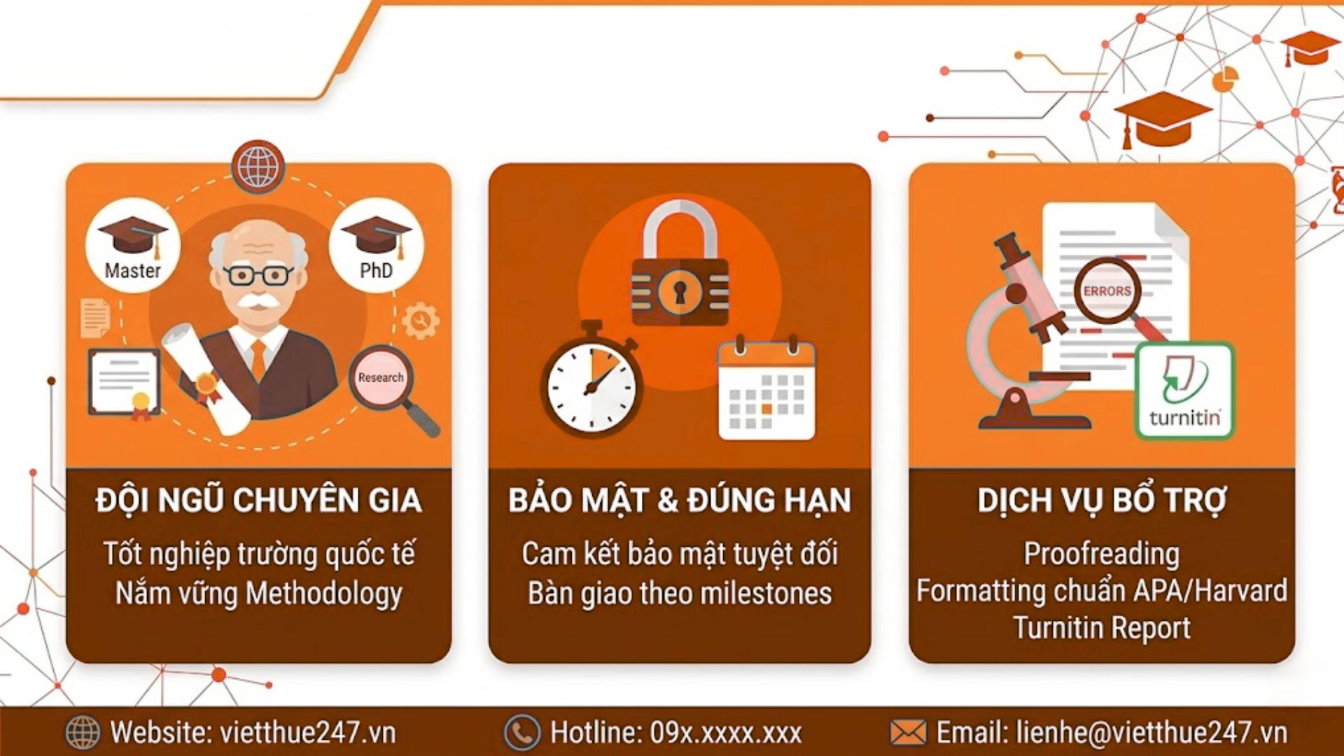 - Bảo mật tuyệt đối: Chúng tôi hiểu rằng thông tin cá nhân và dự án là quý báu. Tại Viết Thuê 247 chúng tôi cam kết đảm bảo tuyệt đối về việc bảo vệ thông tin của khách hàng.