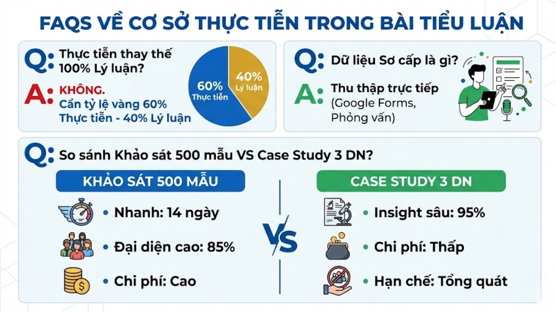 Khảo sát 500 mẫu nhanh 14 ngày, đại diện cao 85% độ tin cậy nhưng tốn 7-10 triệu; case study 3 doanh nghiệp sâu 95% insight chỉ 3-7 triệu nhưng hạn chế tổng quát.