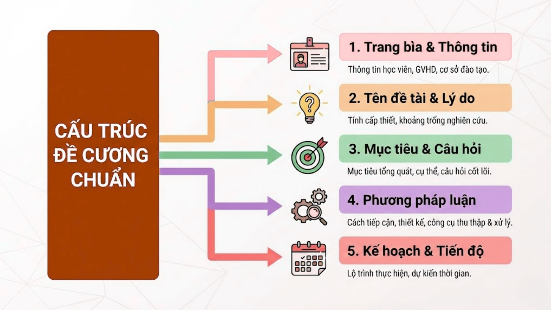 Cấu trúc bản kế hoạch nghiên cứu tiêu chuẩn thường gồm 5 phần chính mạch lạc. Sự sắp xếp này giúp người đọc nắm bắt ý tưởng của bạn nhanh chóng.