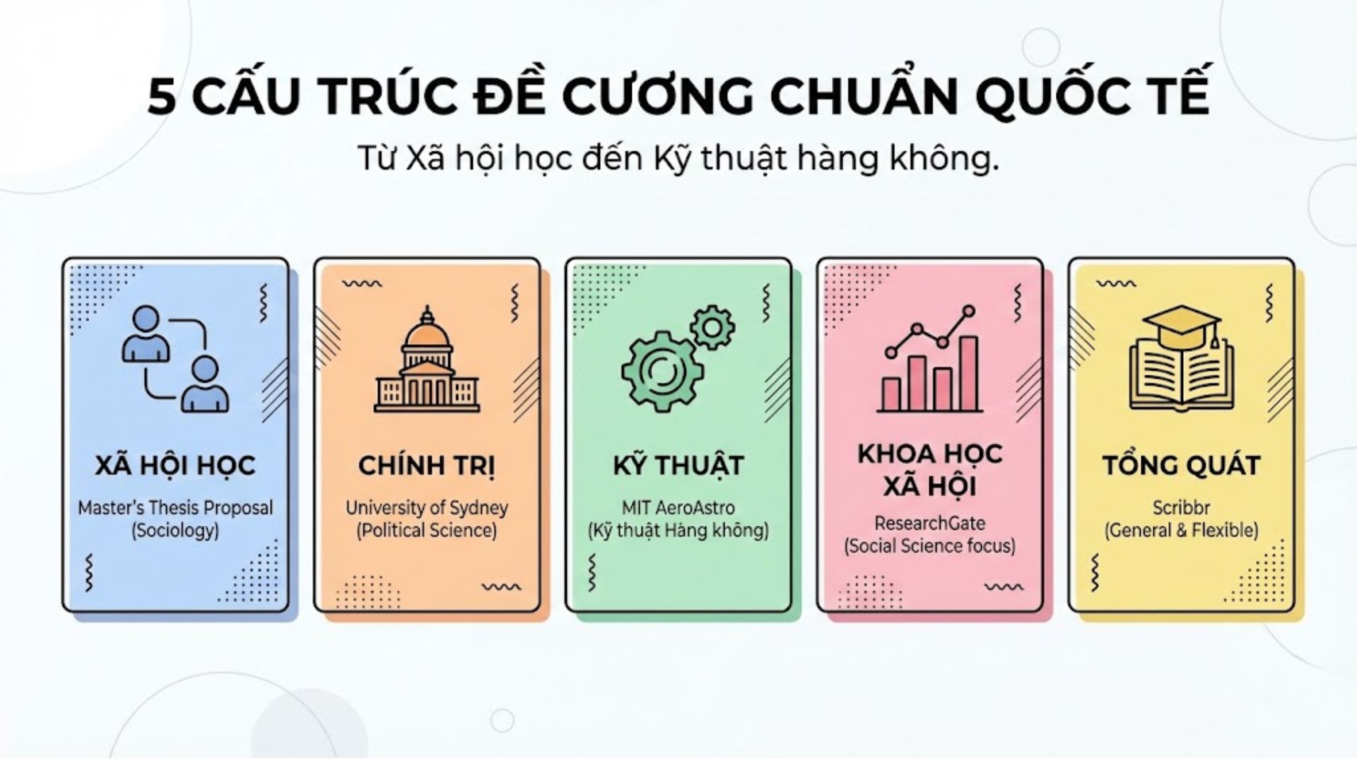 Dưới đây là 5 bài mẫu đề cương (thesis proposal outline) từ các trường đại học uy tín thế giới và Việt Nam, phân theo lĩnh vực từ Xã hội học, Kỹ thuật, đến Khoa học Xã hội & Chính trị. Mỗi mẫu kèm cấu trúc chi tiết, yêu cầu cụ thể, và link tham khảo để sinh viên ngành Tiếng Anh áp dụng linh hoạt.