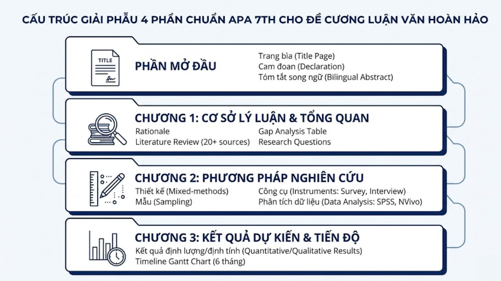 Abstract song ngữ 250 từ, mục lục tự động, Chương 1 (Rationale 1.5 trang + Lit review 5 trang), Chương 2 (Methods: sample, instruments, analysis), Chương 3 (Expected results, Gantt chart), tài liệu APA 30+ nguồn.