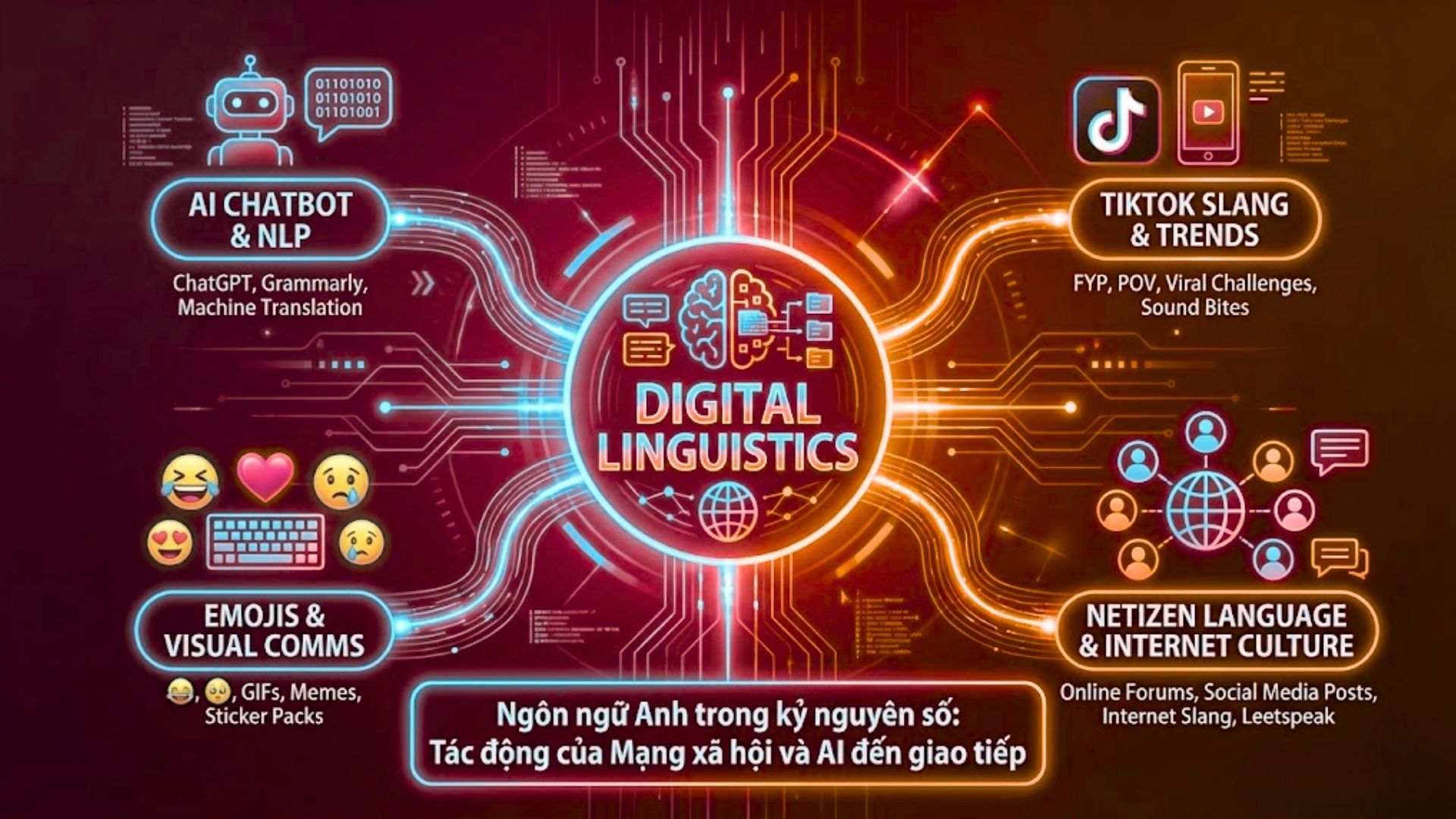 Bảng đề tài công nghệ phản ánh sự chuyển dịch của ngôn ngữ Anh trong môi trường kỹ thuật số.