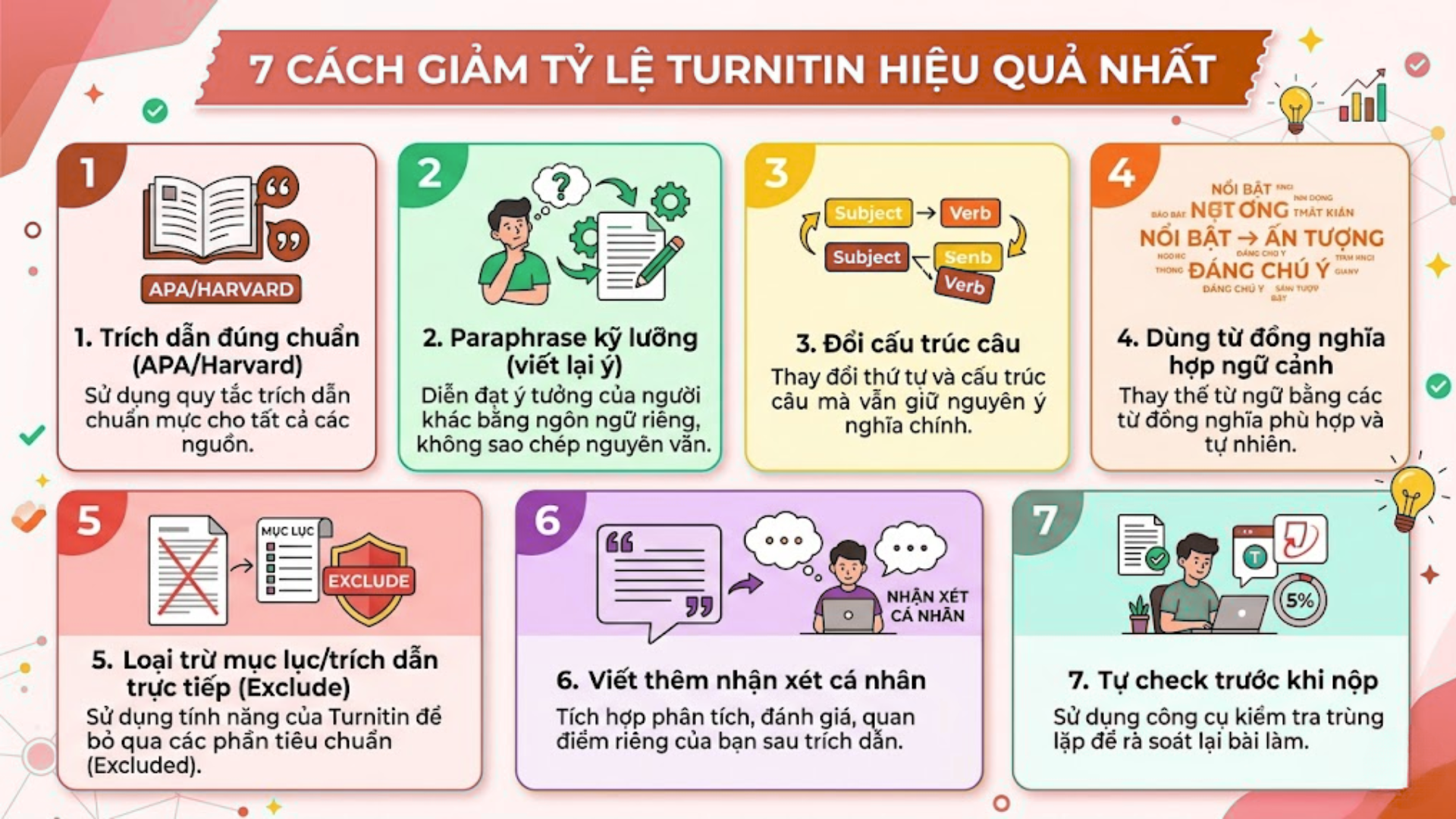 Đây là 7 kỹ thuật đã được kiểm chứng giúp hạ similarity từ 30%+ xuống dưới 20% trong đa số trường hợp. Không có “phép màu” nào giúp giảm Turnitin về 0% một cách hợp lý — bởi bạn luôn cần tham khảo nguồn. Điều quan trọng là đưa tỷ lệ về vùng xanh lá (dưới 24%) bằng các kỹ thuật đúng chuẩn học thuật.