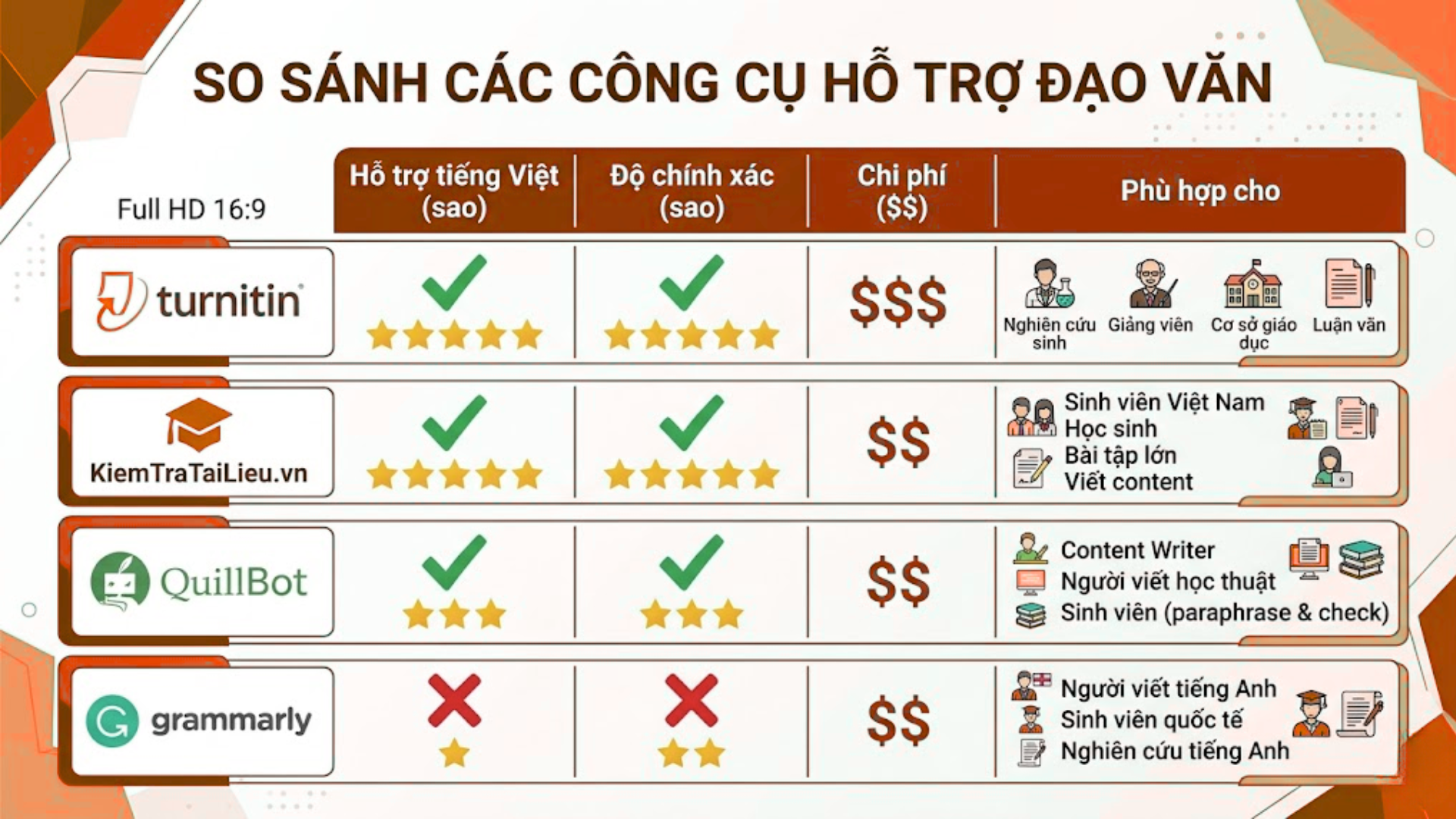 5. So sánh công cụ hỗ trợ giảm đạo văn: Turnitin, QuillBot, Grammarly, KiemTraTaiLieu