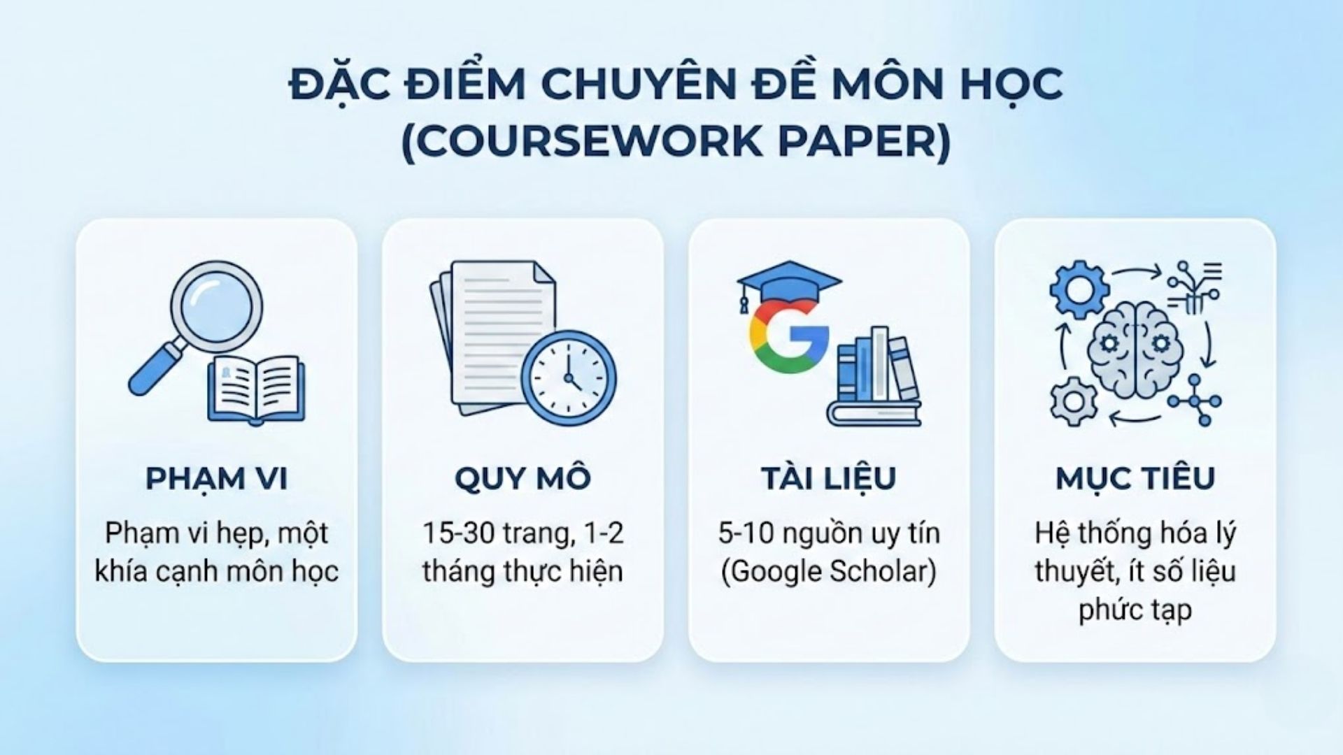 Bài viết phân tích định nghĩa, quy mô và quy trình thực hiện từng loại chuyên đề theo tiêu chuẩn 2026. Thông tin này hỗ trợ sinh viên tối ưu hóa kết quả học tập và định hướng bảo vệ tốt nghiệp thành công rực rỡ.