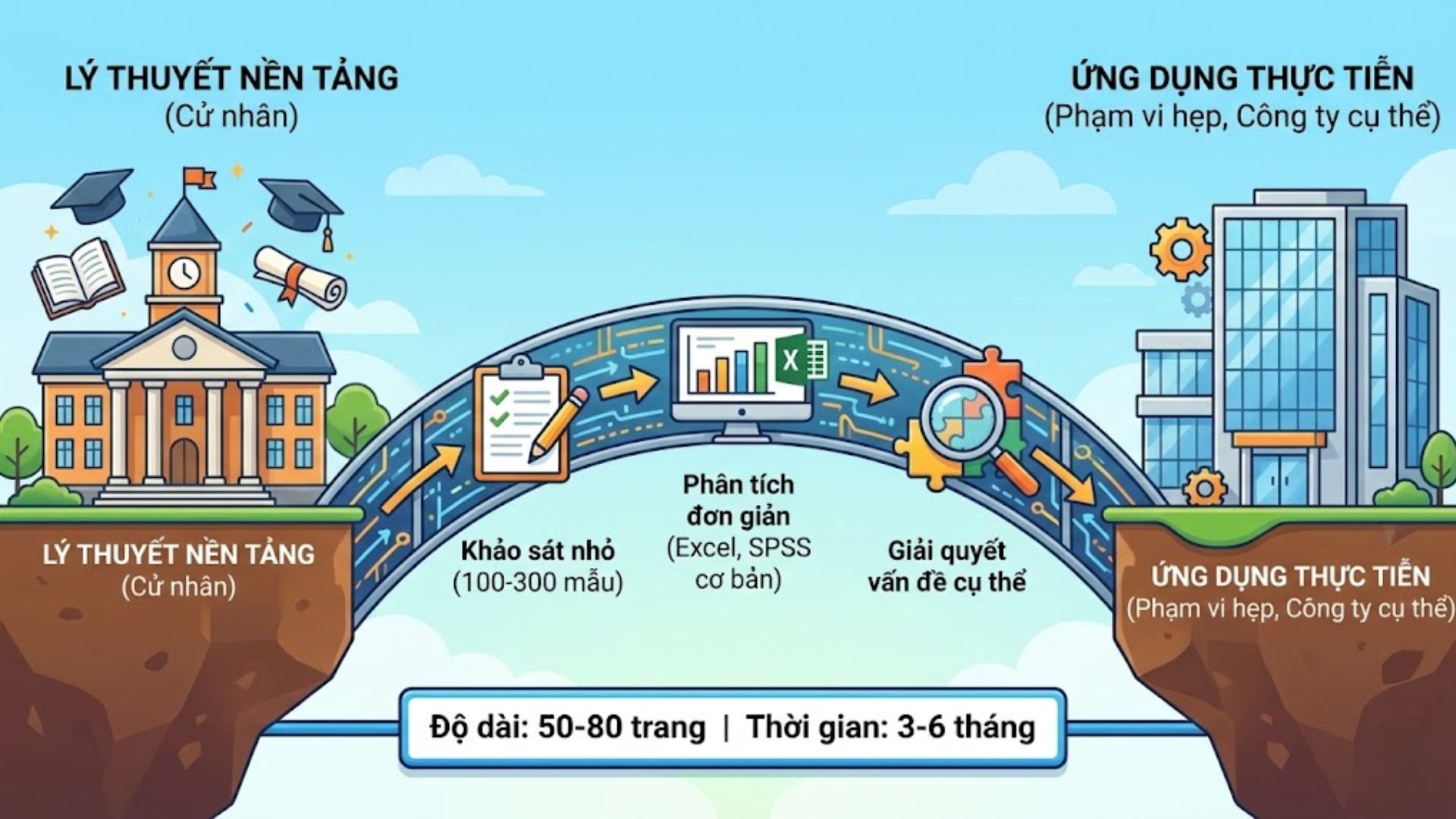 - Khóa luận tốt nghiệp: Phạm vi hẹp, cụ thể. Tập trung vào một vấn đề thực tiễn (ví dụ: phân tích hiệu quả marketing của Công ty ABC). Phương pháp đơn giản: khảo sát 100-300 mẫu, phân tích thống kê mô tả, hồi quy tuyến tính đơn giản. Độ dài 50-80 trang.