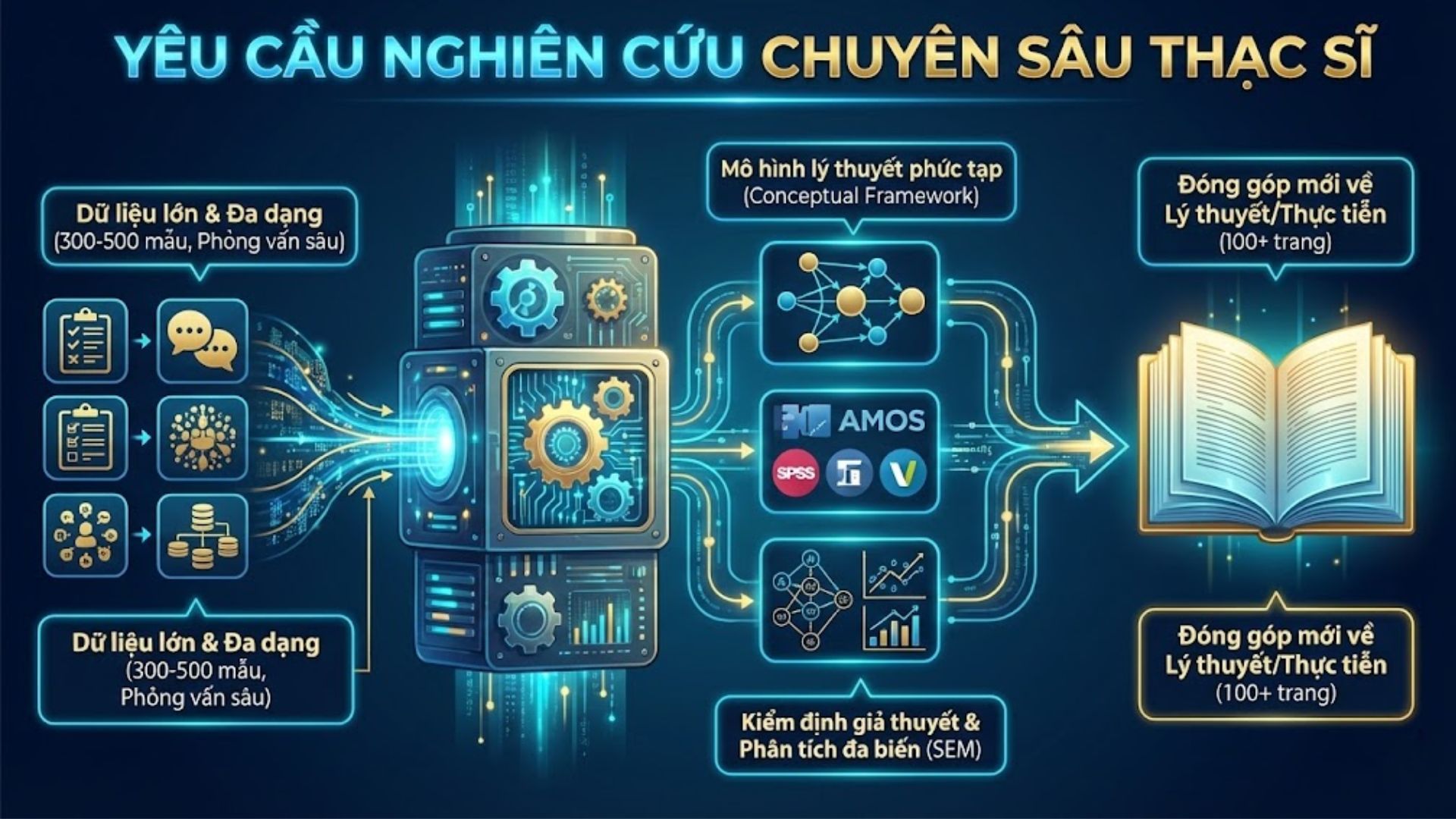 Ví dụ, tại Đại học Quốc gia Hà Nội, luận văn thạc sĩ ngành Quản trị kinh doanh yêu cầu khảo sát 400 doanh nghiệp, phân tích SEM, hoàn thành trong 10-12 tháng.