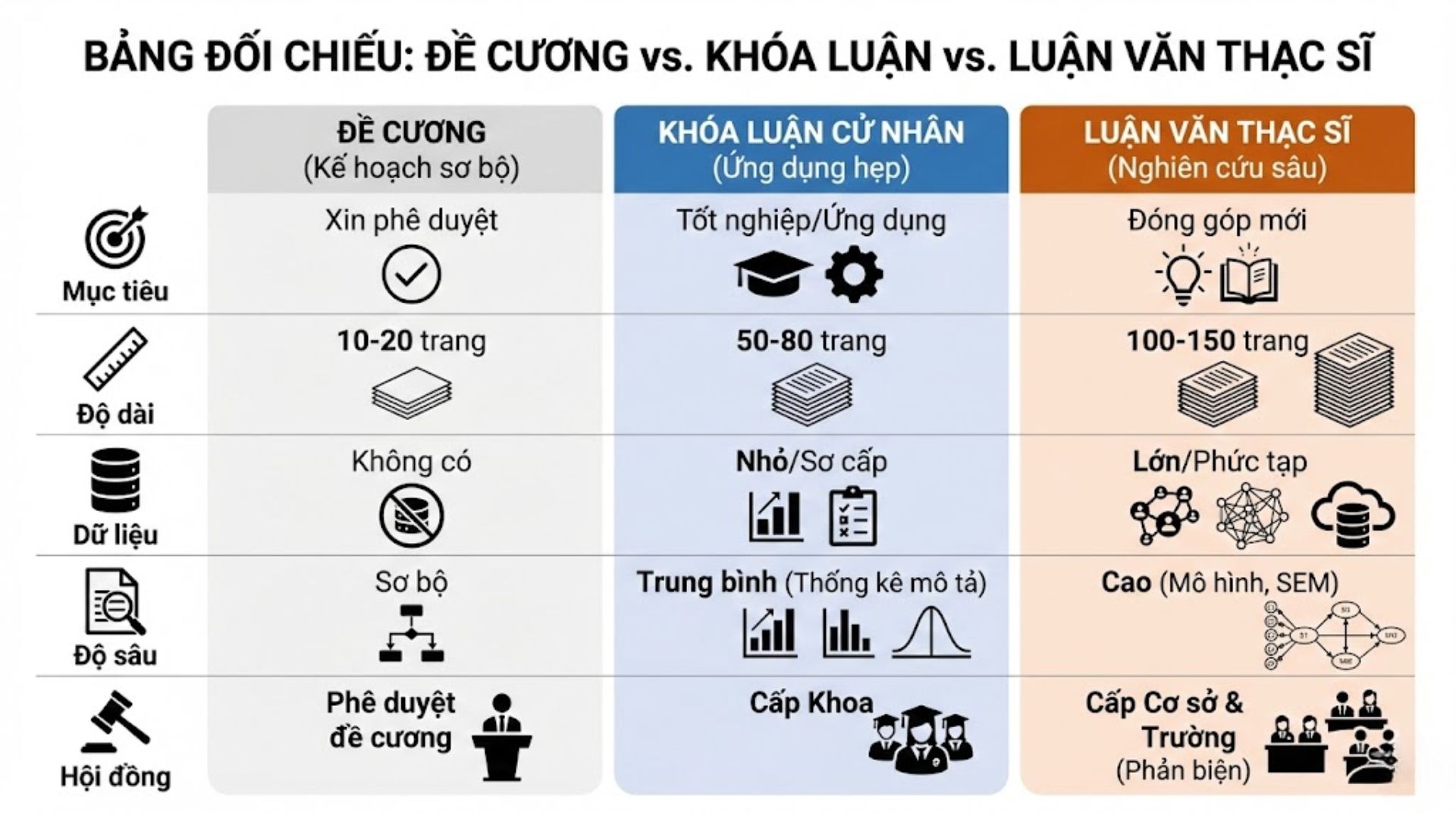 Ba sản phẩm học thuật này khác biệt rõ rệt về mục đích, độ dài, độ sâu nghiên cứu và cấp độ học thuật. Đề cương luận văn là bản kế hoạch sơ bộ, được phê duyệt trước khi nghiên cứu. Khóa luận tốt nghiệp là nghiên cứu ứng dụng cấp đại học, phạm vi hẹp. Luận văn thạc sĩ là công trình nghiên cứu chuyên sâu cấp cao học, yêu cầu mô hình lý thuyết và phân tích dữ liệu phức tạp.