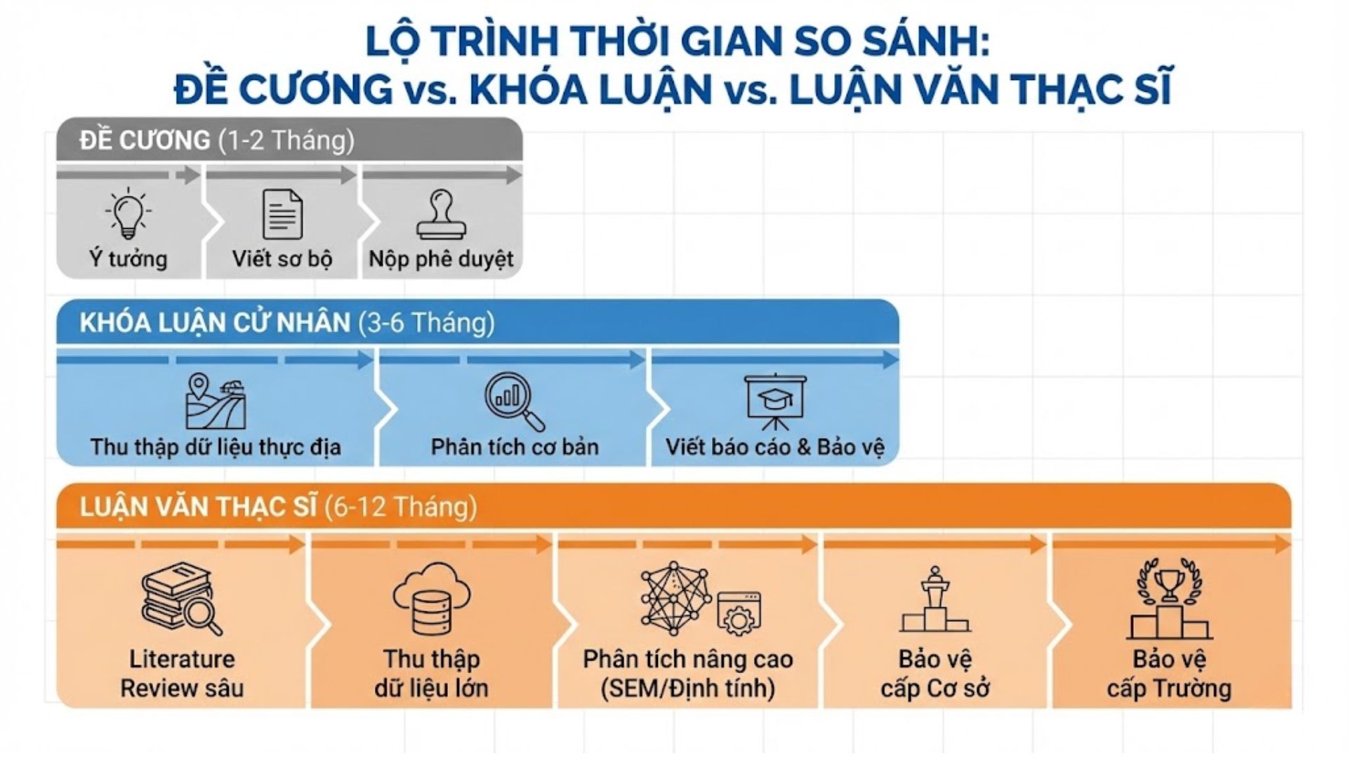 Quy trình và thời gian hoàn thành 3 sản phẩm học thuật khác biệt rõ rệt, từ 1-2 tháng (đề cương) đến 6-12 tháng (luận văn thạc sĩ). Hiểu rõ từng giai đoạn giúp lập kế hoạch học tập hiệu quả.
