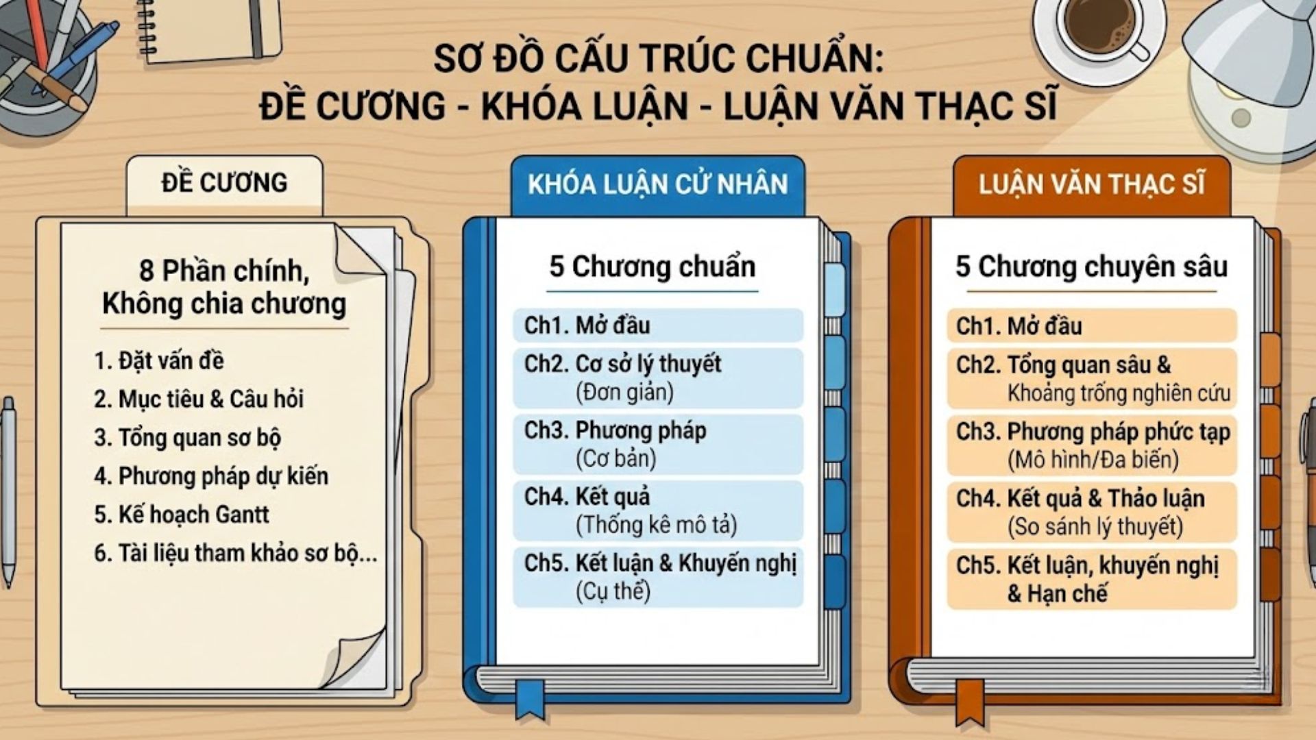 Cấu trúc 3 sản phẩm học thuật khác biệt rõ về số chương, độ chi tiết và yêu cầu từng phần. Dưới đây là cấu trúc chuẩn theo quy định Bộ Giáo dục và các trường đại học lớn tại Việt Nam.