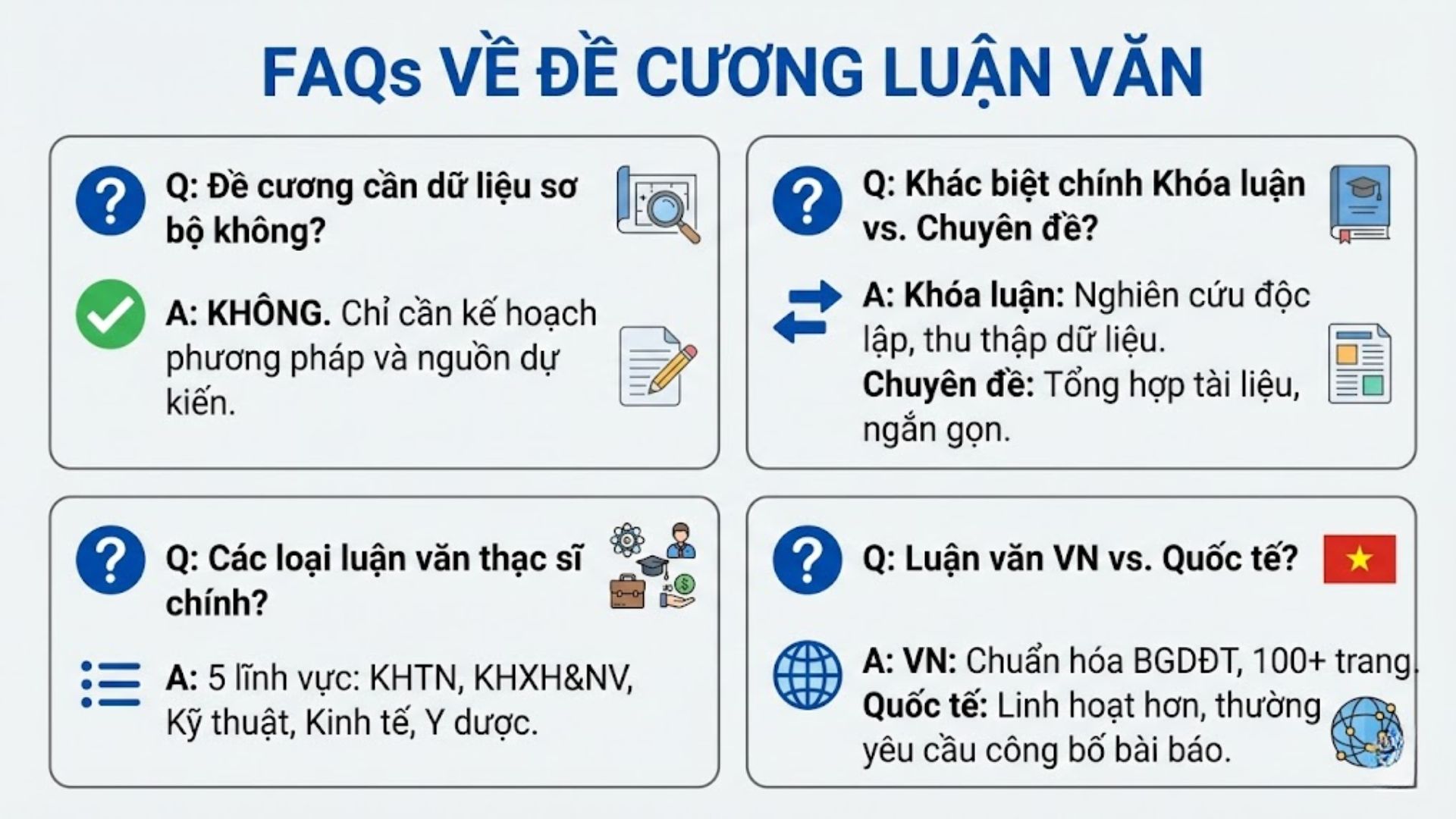 Ví dụ, tại Đại học Quốc gia Hà Nội, đề cương luận văn thạc sĩ ngành Kinh tế phát triển yêu cầu trình bày 5 phần: Đặt vấn đề, Tổng quan nghiên cứu, Mục tiêu và câu hỏi, Phương pháp dự kiến, Kế hoạch thực hiện. Đề cương giúp định hướng toàn bộ quá trình nghiên cứu, tránh lãng phí thời gian và nguồn lực khi thực hiện đề tài không khả thi hoặc trùng lặp.