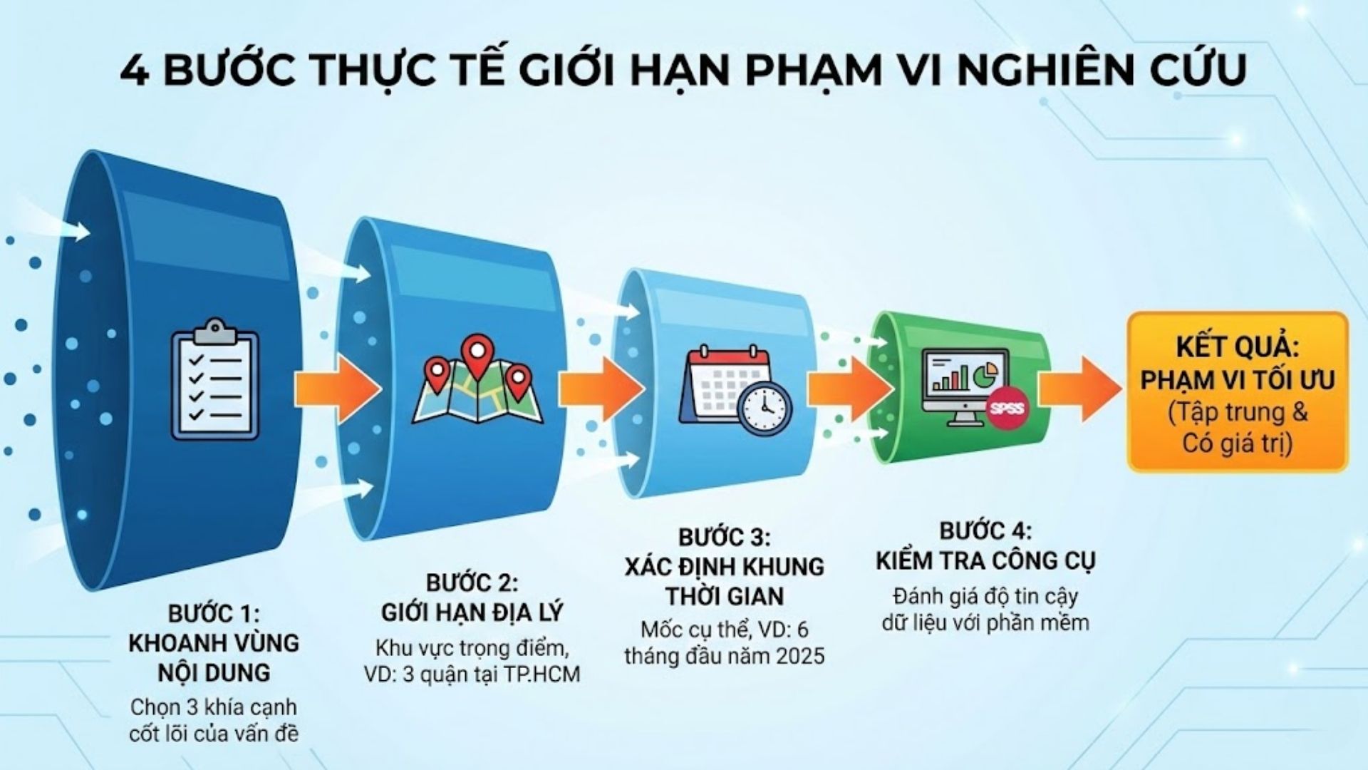 Phạm vi nghiên cứu là việc thiết lập các giới hạn để khảo sát đối tượng trong một không gian và thời gian nhất định. Đây là công cụ giúp thu hẹp đề tài, đảm bảo tính khả thi cho người thực hiện. Ví dụ: Nghiên cứu tại 3 quận TP.HCM trong giai đoạn 2025-2026.