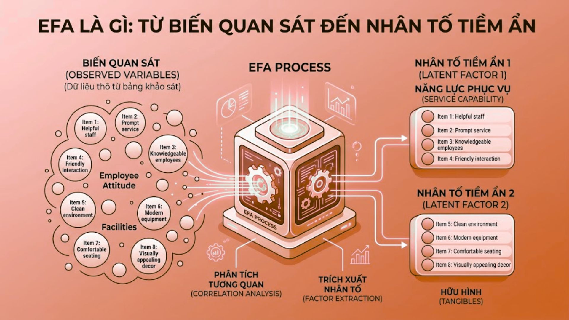 Ví dụ: Trong khảo sát Marketing về “Chất lượng dịch vụ”, 10 câu hỏi nhỏ về thái độ nhân viên và cơ sở vật chất có thể được EFA gom lại thành 2 nhân tố chính là “Năng lực phục vụ” và “Hữu hình”. Điều này giúp mô hình nghiên cứu trở nên tinh gọn và chính xác hơn.
