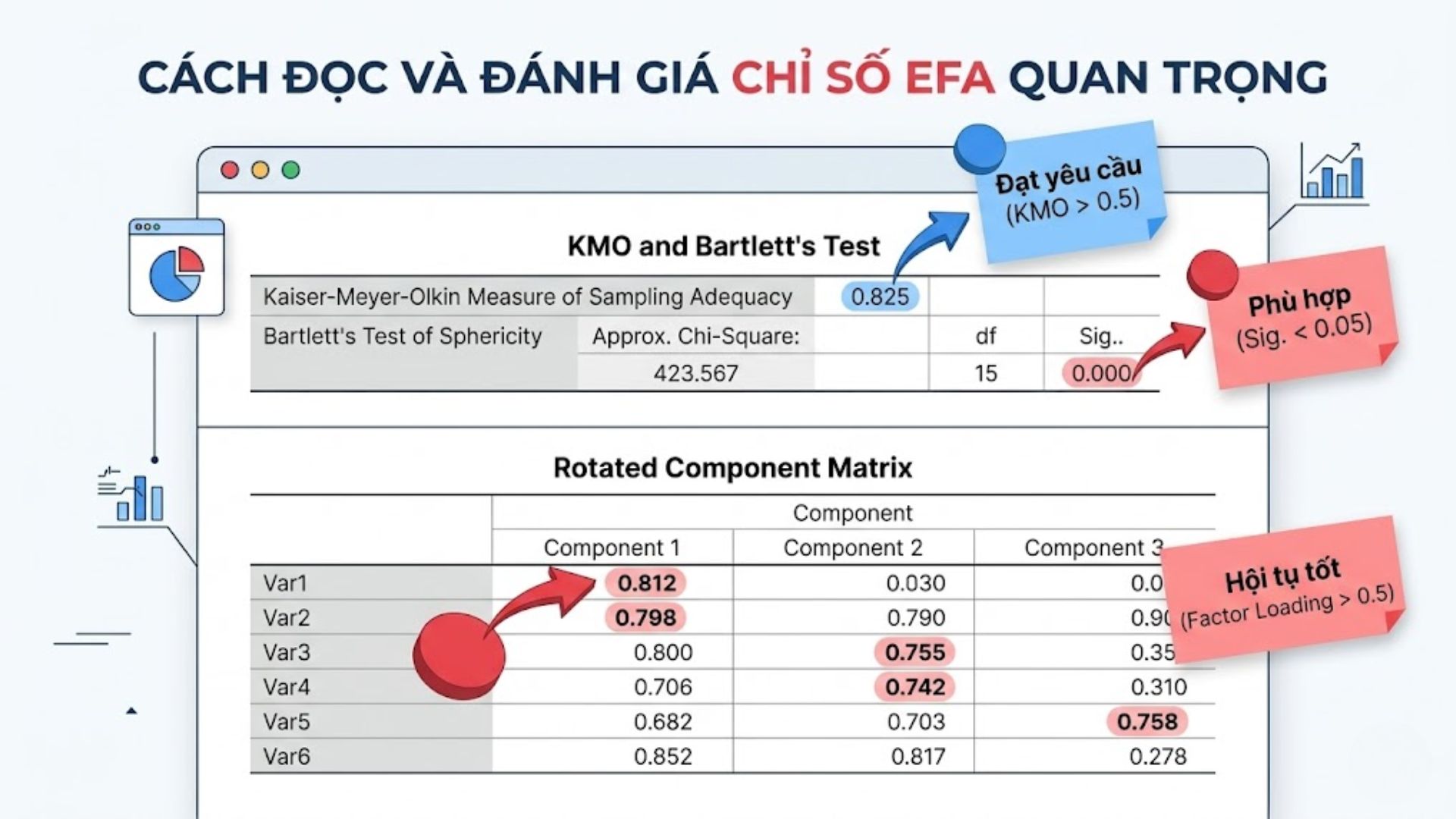 Việc đọc hiểu kết quả EFA đòi hỏi sự chính xác qua 03 bảng biểu quan trọng nhất trong kết quả xuất ra từ SPSS.