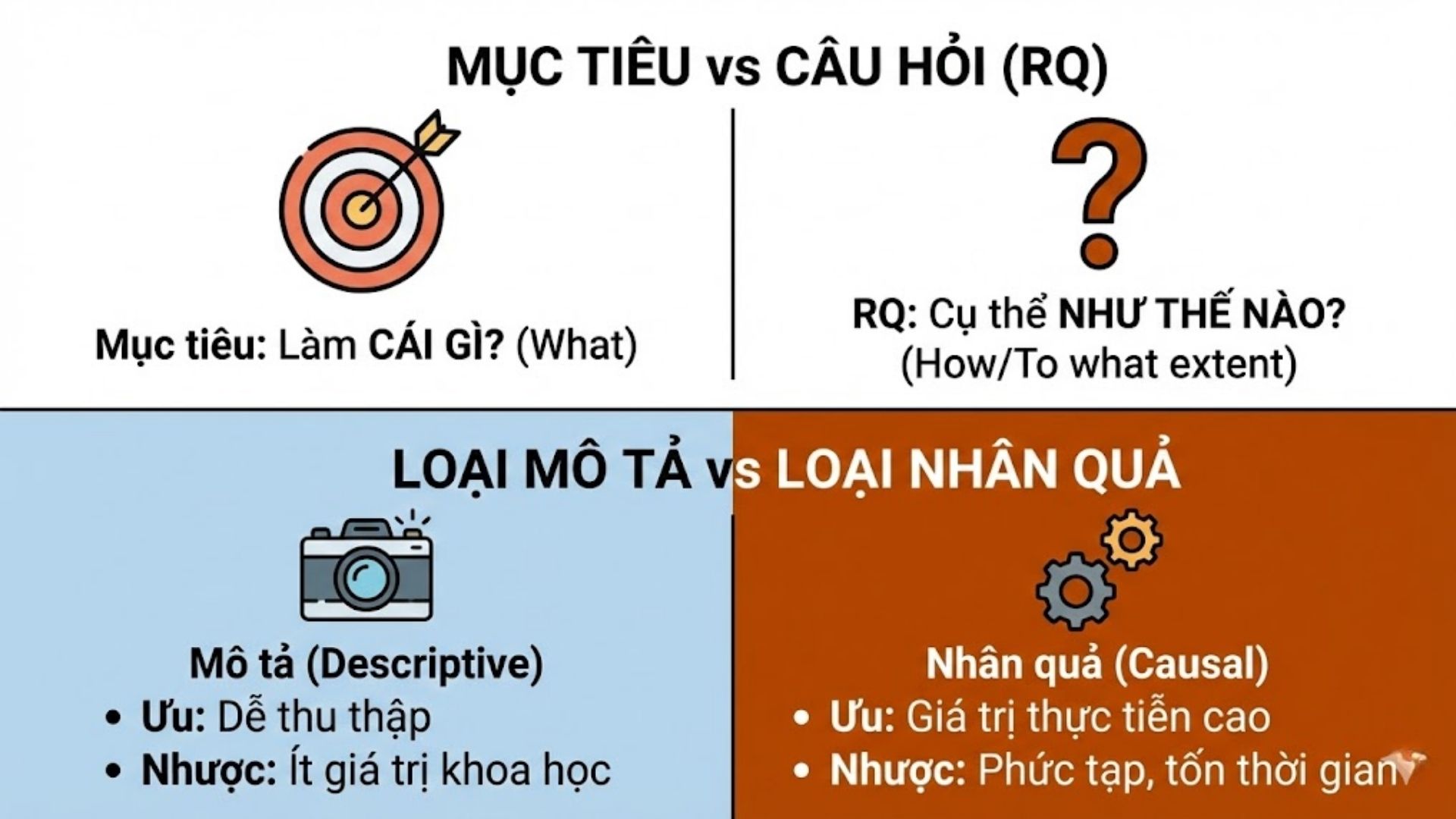 Mô tả (ví dụ: “Hành vi mua sắm Gen Z như thế nào?”) dễ thu thập dữ liệu nhưng ít giá trị khoa học. Nhân quả (ví dụ: “TikTok tăng doanh thu bao nhiêu %?”) phức tạp hơn nhưng đóng góp cao hơn cho thực tiễn và lý thuyết.