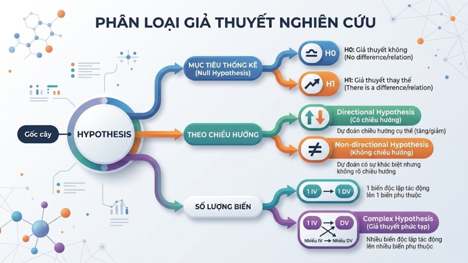 Trong nghiên cứu học thuật, các chuyên gia thường chia giả thuyết thành 3 nhóm chính để tối ưu hóa quá trình phân tích số liệu.