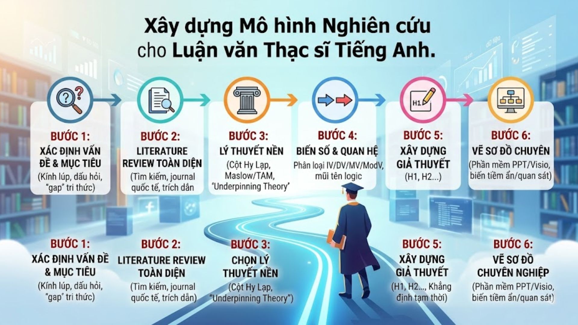 Xây dựng mô hình nghiên cứu cho luận văn tiếng Anh yêu cầu sự kết hợp giữa lý thuyết nền tảng và tư duy logic sắc bén. Bằng cách tuân thủ quy trình 6 bước và sử dụng công cụ kiểm định như AMOS, bạn sẽ tạo nên một công trình khoa học chất lượng.