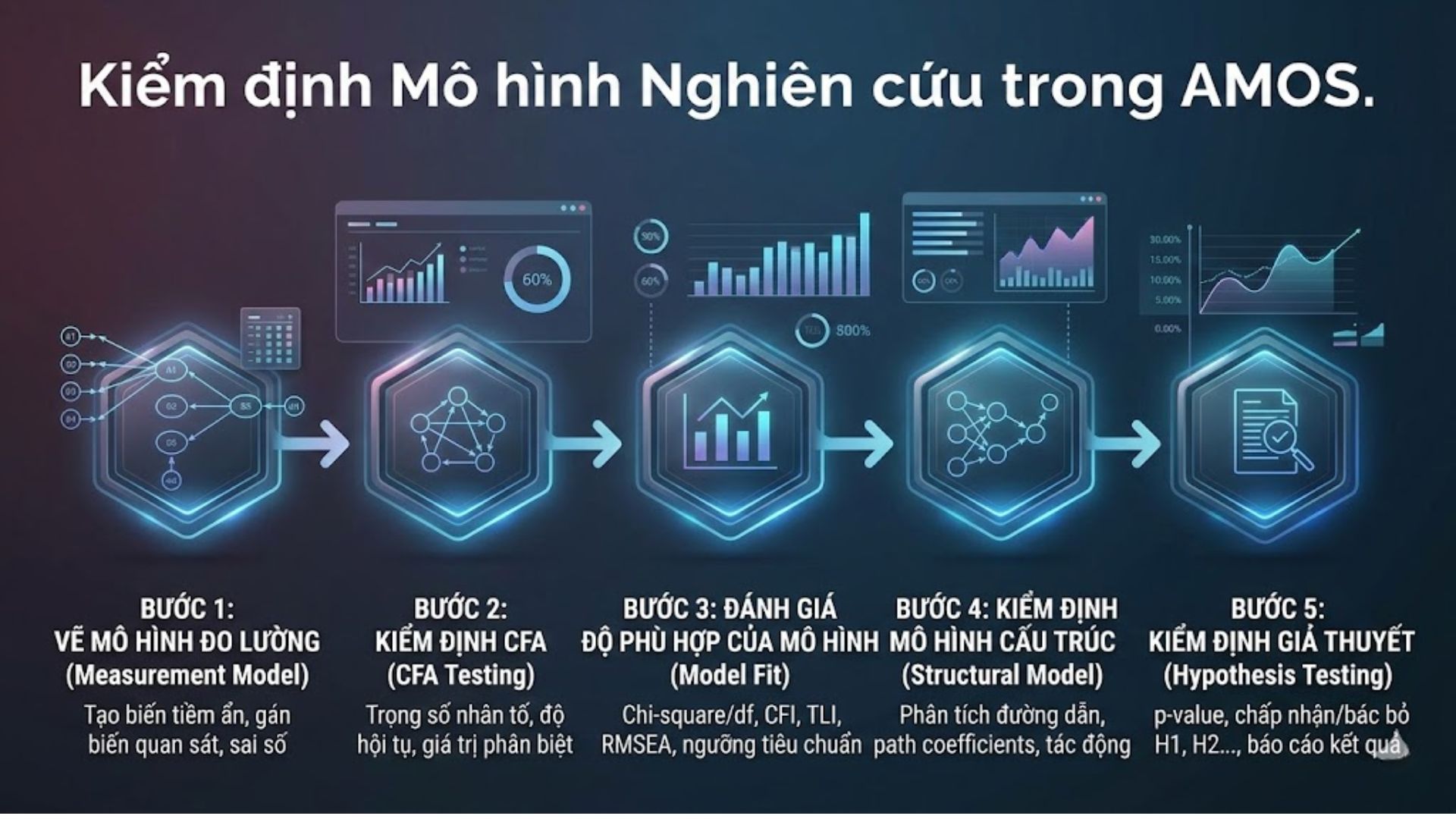 Vai trò của AMOS: Thực hiện kiểm định CFA để đánh giá thang đo và kiểm định Structural Model để xác nhận các giả thuyết nghiên cứu.