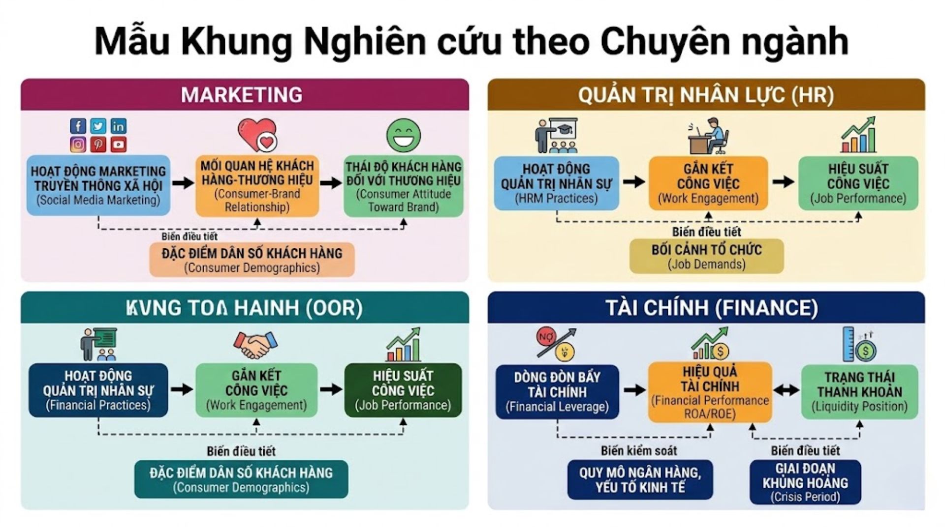Dưới đây là 3 mẫu khung nghiên cứu điển hình được áp dụng rộng rãi trong các chuyên ngành Marketing, Nhân sự và Tài chính.